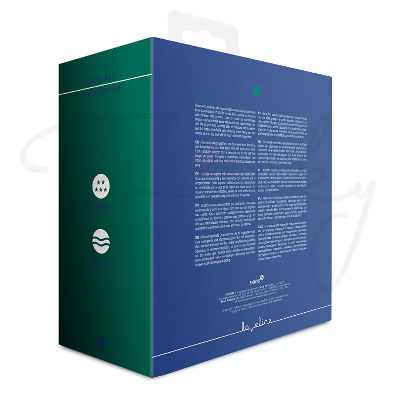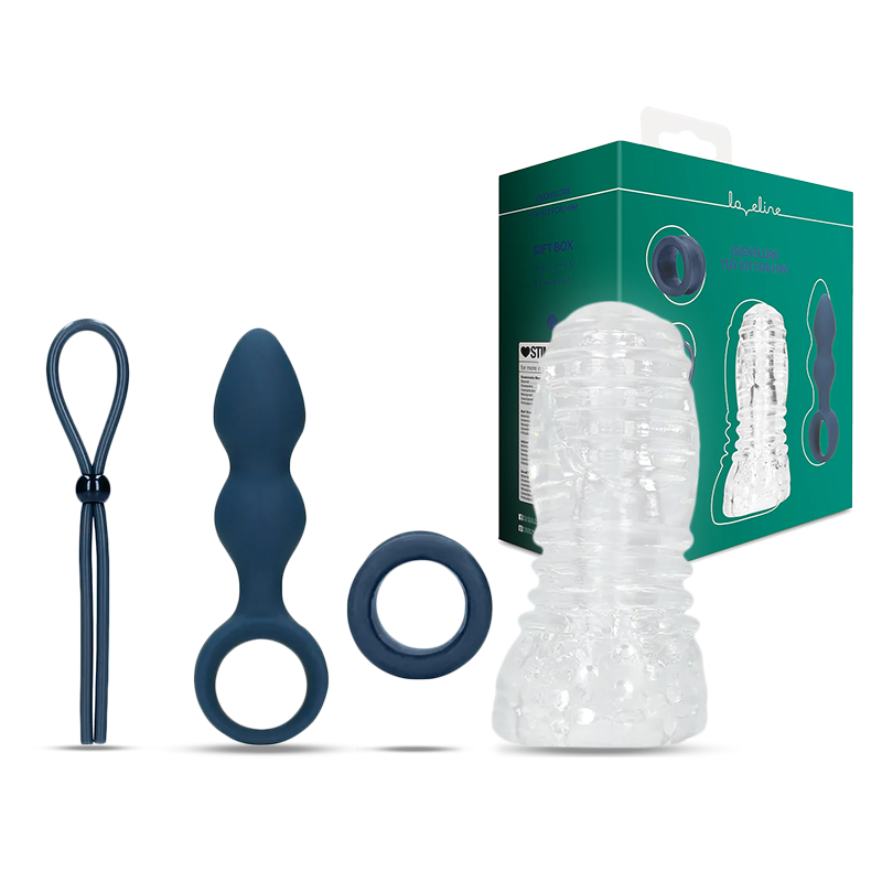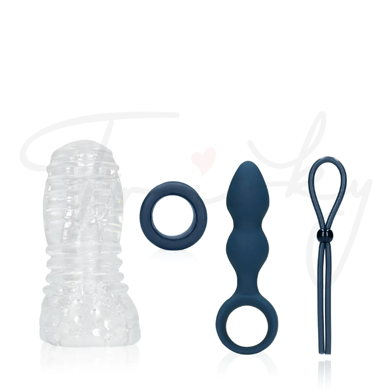 The most exciting giftbox you have ever seen! A thrilling collection of reusable items designed to blow your mind and keep the pleasure going. This box includes a stretchable masturbator, ball strap, adjustable cock ring, and a small teardrop-shaped anal plug.