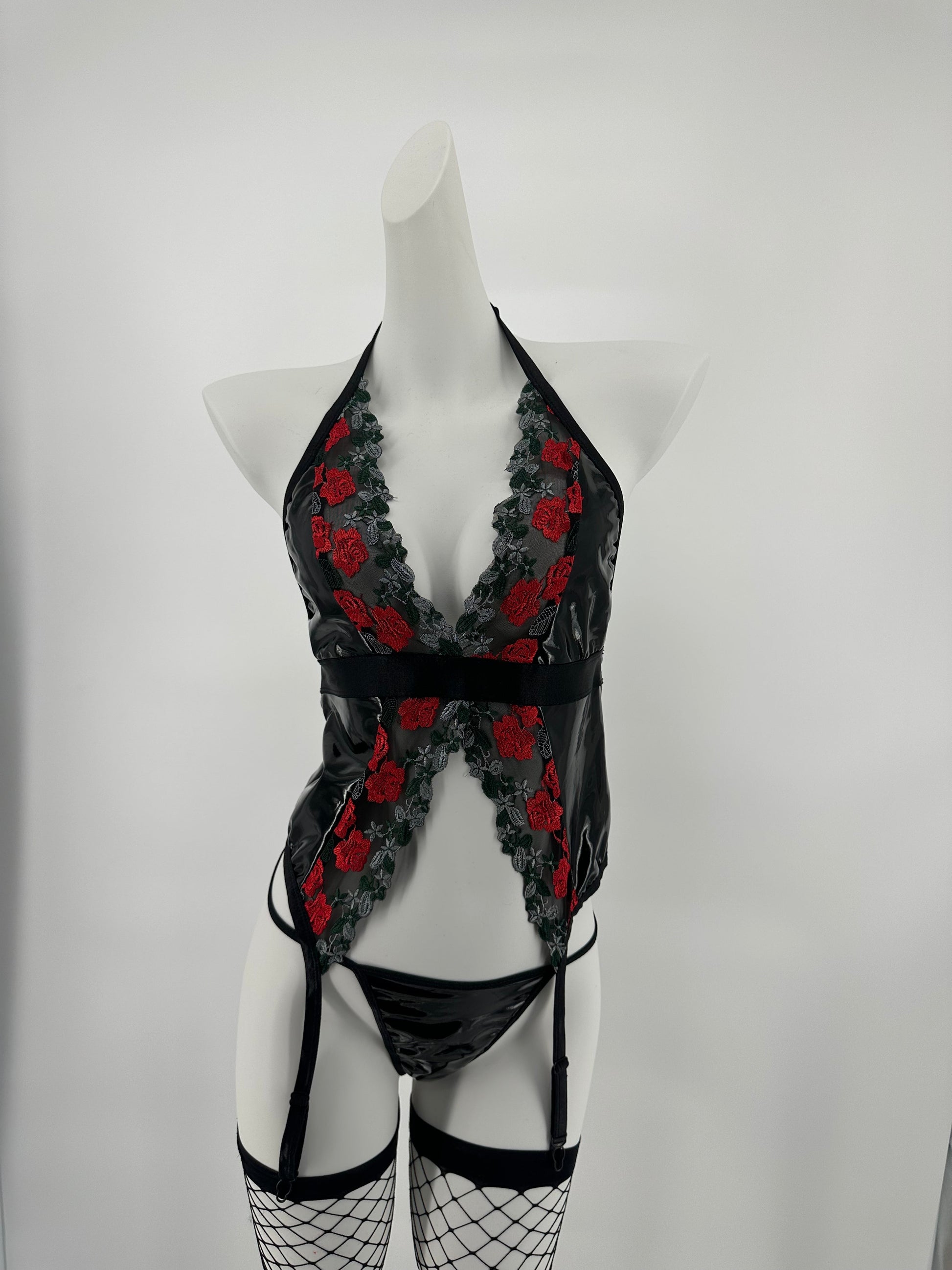 Teddy - 3 Pcs Rose PU Leather Backless Sexy Lingerie with Thongs and Stockings