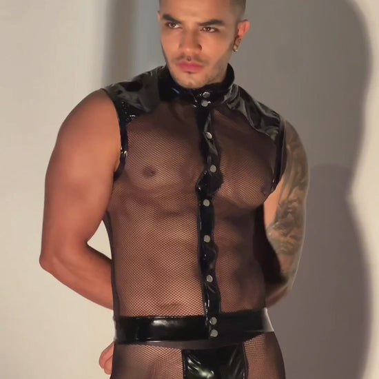 Gentsuit - 2 Pcs Black Open-Button Fishnet Men Costume with Sexy Underwear