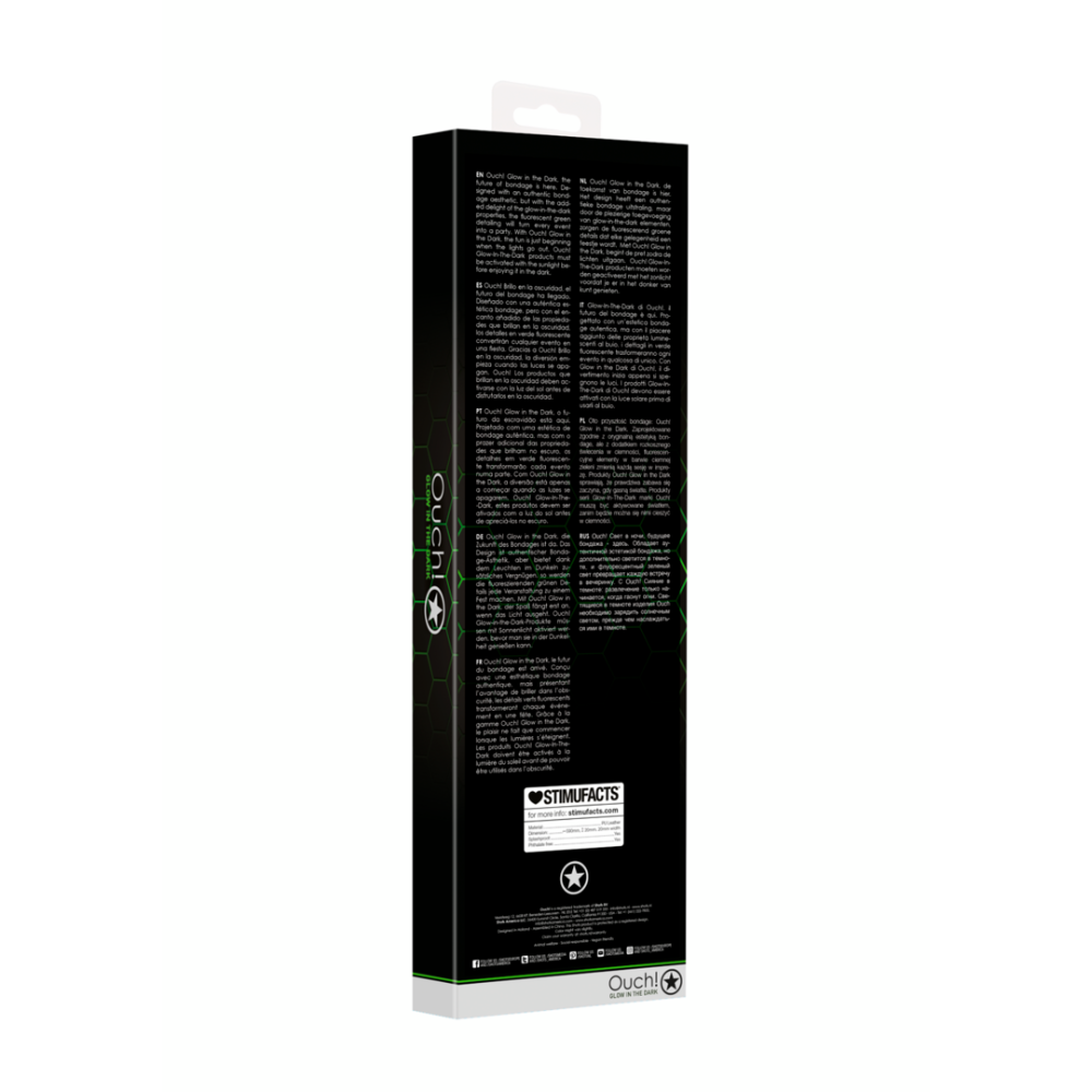 Ouch! Glow in the Dark, the future of bondage is here. Designed with an authentic bondage aesthetic, this flogger features fluorescent green detailing that glows in the dark, turning every session into an electrifying experience. Tease, please, or whip your lover into submission with this versatile and visually captivating flogger. The sturdy handle ensures a perfect grip for controlled, sensual strokes or intense, satisfying impact. Activate it with sunlight for a striking glow that enhances your nighttime play.