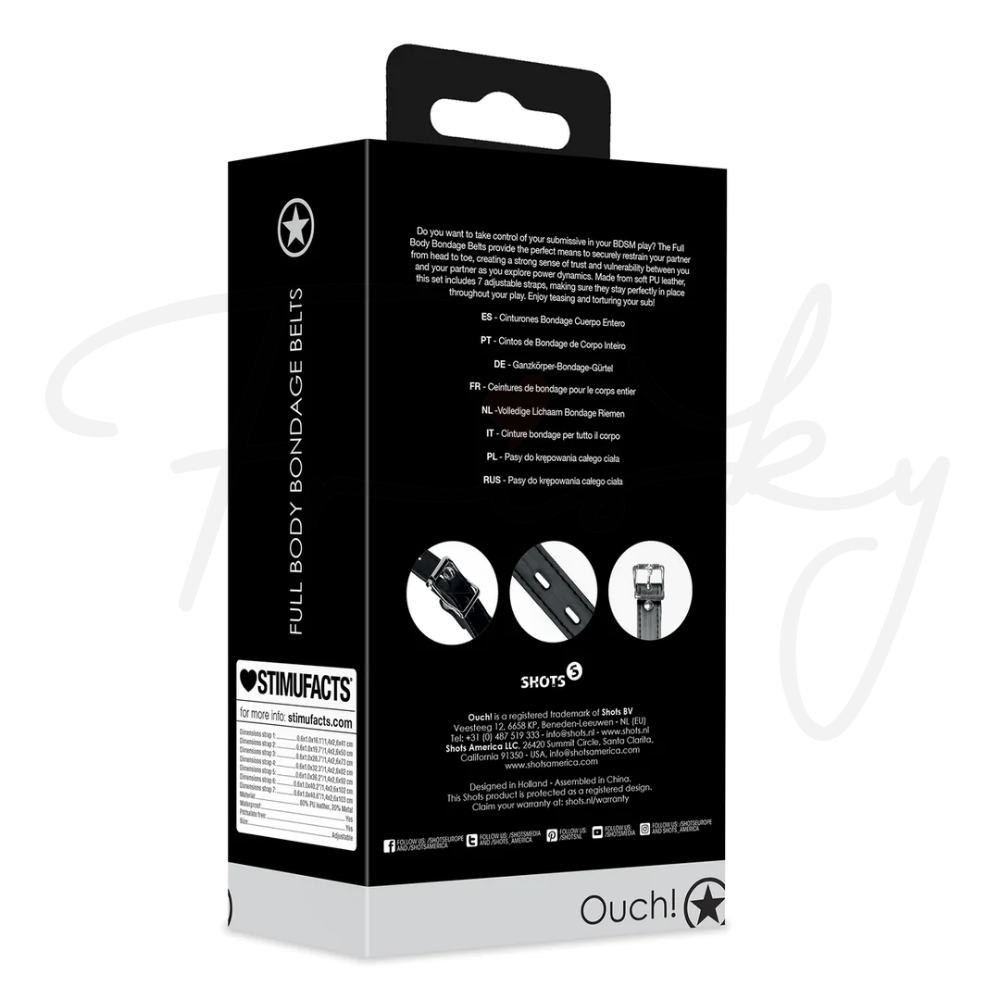 Take control in your BDSM play with the Full Body Bondage Belts. This set of 7 adjustable straps allows for perfect restraint from head to toe, offering endless possibilities for dominance and submission. Made from soft PU leather, it ensures comfort without compromising on security, making every session an unforgettable experience.